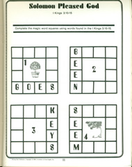 Consists of an assortment of mazes, secret words, puzzles, crosswords, letter mazes, fill in the blank, coloring, and other types of activities, with an answer key, table of contents, Scripture references and an award certificate.